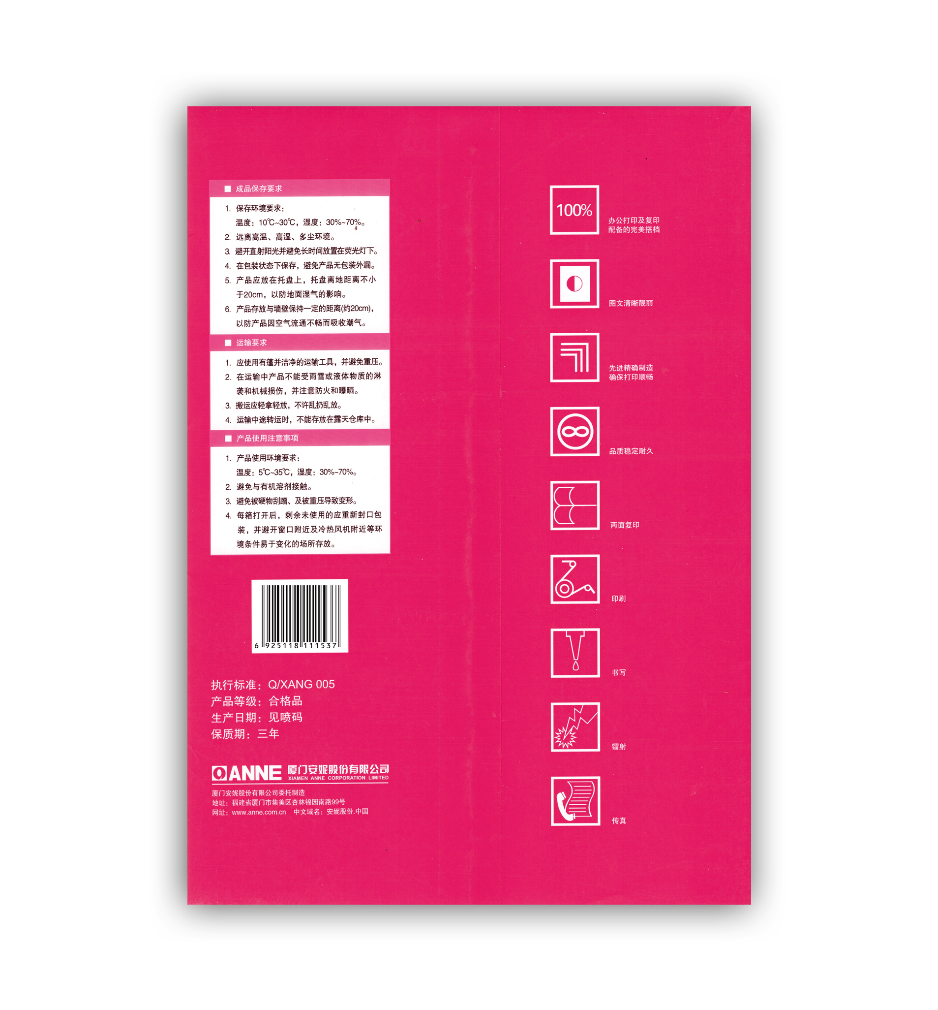 商品属性 [系列] 安妮 特白 [克数] 80g [纸张大小] A4 [每包张数] 500张/包 [包数] 10包 [颜色分类] 粉红色 [环保清单] 否 [质量等级] 合格 [原材料类别] 原生纸 [中国环境标志产品认证证书编号] - [中国环境标志产品认证证书有效期] [产品尺寸(mm)] 210*297 [包装清单] [售后服务] [国别] [中国节能产品认证证书编号] [中国节能产品认证证书有效期] [中国节能产品认证证书扫面件] [中国环境标志产品认证证书扫描件] [原厂质保期限(年)]